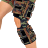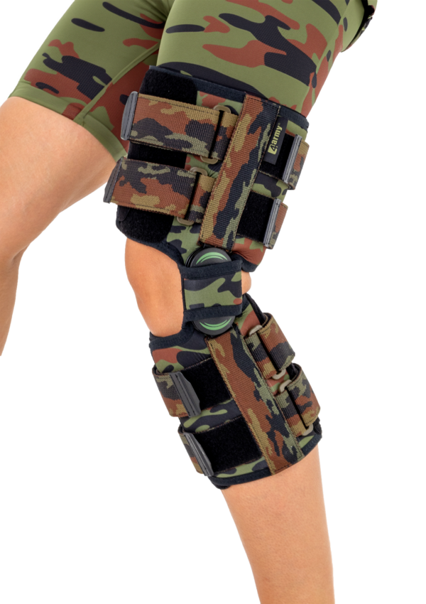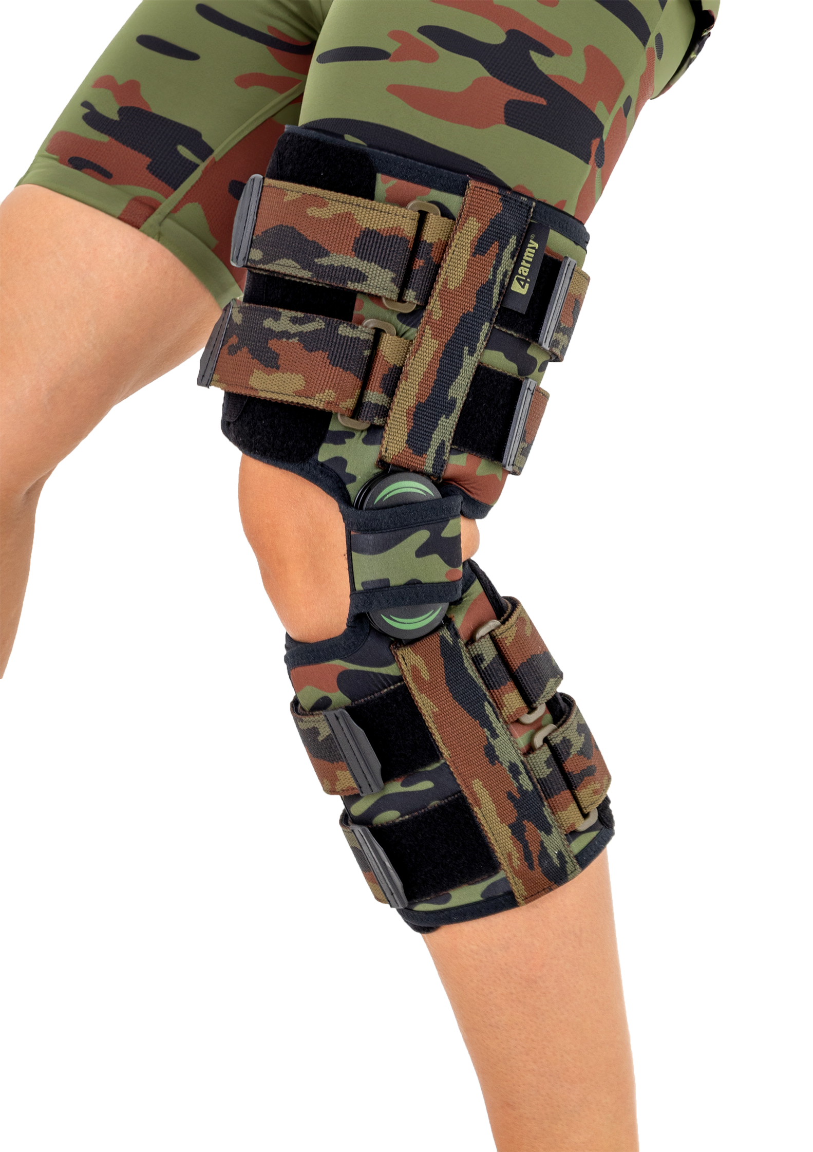 ORTEZA KOLANA Ortezy grupy 4Army, to specjalnie dedykowana linia ortez ortopedycznych, charakteryzująca się anatomiczną konstrukcją, zdecydowanie zwiększoną wytrzymałością oraz wykończeniem w militarnym kamuflażu typu pantera. Ortezy te są wyrobami medycznymi klasy I, i doskonale sprawdzają się jako zabezpieczenie stawów w trudnych warunkach, wymagających zwiększonej wytrzymałości wyrobu. Orteza kolana 4ARMY-SK-11  to doskonały produkt w przypadku występowania ryzyka zmian zwyrodnieniowych stawu. Orteza posiada otwartą konstrukcję, dlatego jej aplikacja jest wyjątkowo łatwa i prosta, nawet u osób ze znaczną nadwagą czy ograniczoną mobilnością. Orteza została wykonana z ultralekkich surowców, zwiększających komfort użytkowania. Wyrób powstał z wodoodpornego surowca ActivePren™. ActivePren™ to aktywny trójwarstwowy surowiec składający się z dwóch elastycznych jerseyowych dzianin okładkowych oraz rdzenia wykonanego z pianki neoprenowej. Materiał ten charakteryzuje się miękkością i wysoką elastycznością. Bardzo ważnym atutem tego surowca jest to, że nie jest to wyrób dziany, nie posiada grubych włókien, przez co sploty materiału nie odciskają się na skórze pacjenta i nie powodują ran w miejscach o dużej kompresji. Ortezy wykonane z surowca ActivePren™ to najmocniejsze i najskuteczniej stabilizujące ortezy dostępne na rynku. Usztywnieniem wyrobu są szyny 2R zamontowane w mocnych tunelach z taśmy. Konstrukcja ortezy pozwala na jej stosowanie w przypadku występowania torbieli Bakera. Wyrób posiada otwarty dół podkolanowy, dzięki czemu nie powoduje ucisku w lokalizacji cysty. Pozwala również na zmianę opatrunków w tym miejscu, bez konieczności zdejmowania ortezy. Orteza kolana 4ARMY-SK-11 stanowi doskonałe wsparcie w przypadku występowania niestabilności i dolegliwości bólowych stawu. Przywraca osiowe ustawienie kończyny i fizjologiczny wzorzec ruchu, odciążając tym samym staw kolanowy i wszystkie otaczające go tkanki miękkie.   Orteza kolana 4ARMY-SK-11 stabilizuje staw kolanowy, a także w razie potrzeby umożliwia jego unieruchomienie. Orteza zapewnia szeroki zakres regulacji obwodowej. Dzięki temu, może być skutecznie stosowana nawet w przypadku zmian w zakresach obwodowych kończyny, np. po zmniejszeniu obrzęków i wysięków w obrębie kończyny dolnej.