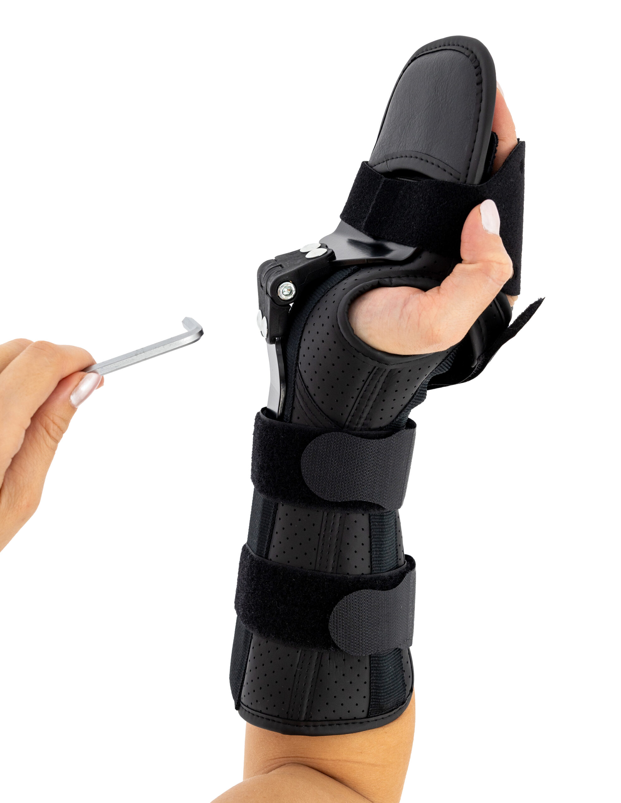 Wyrób posiada konstrukcję otwartą co ułatwia jego zakładanie na kończynę oraz regulowane zapięcie przednie co czyni ortezę jeszcze bardziej uniwersalną i ułatwia dopasowanie do każdego kształtu dłoni.