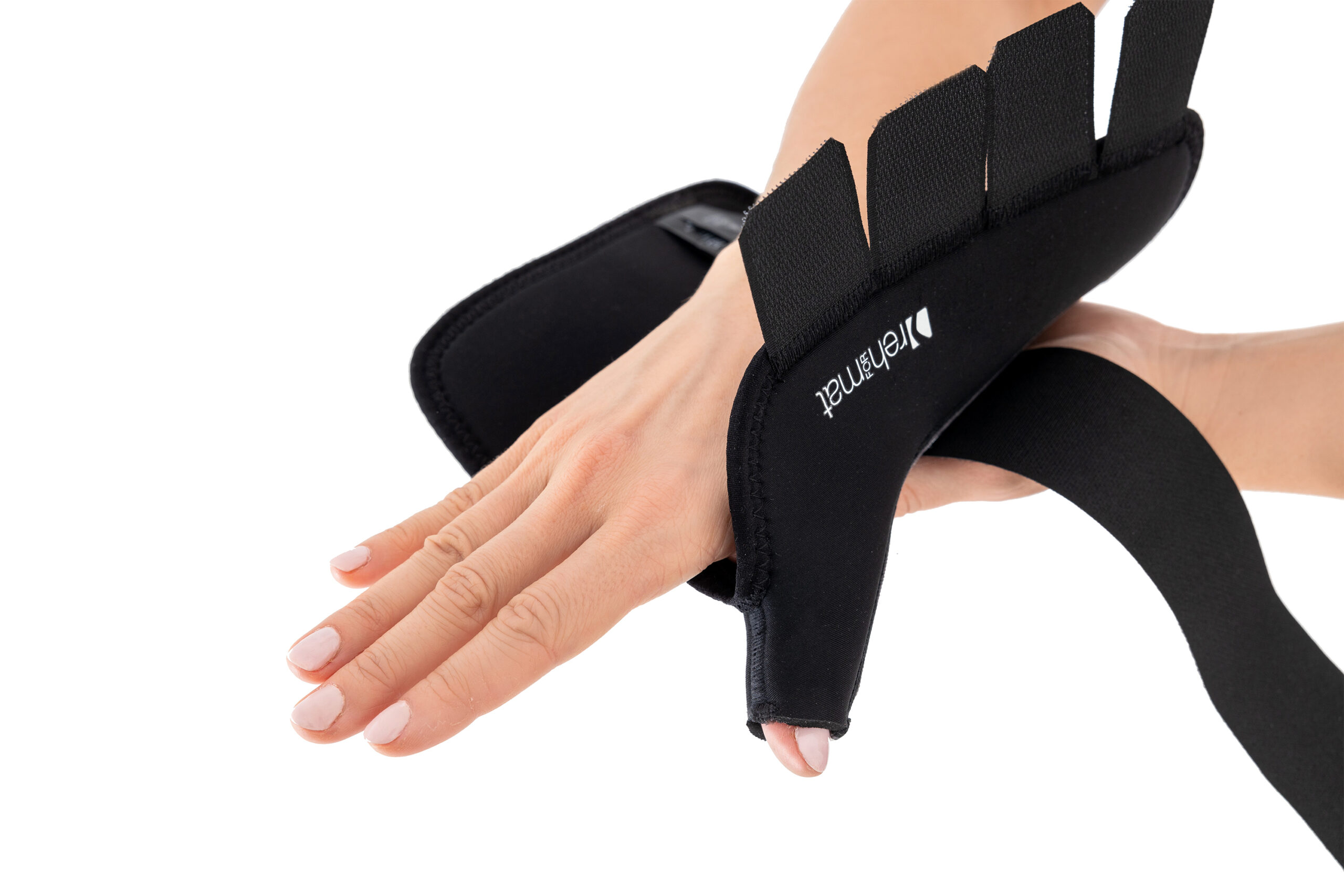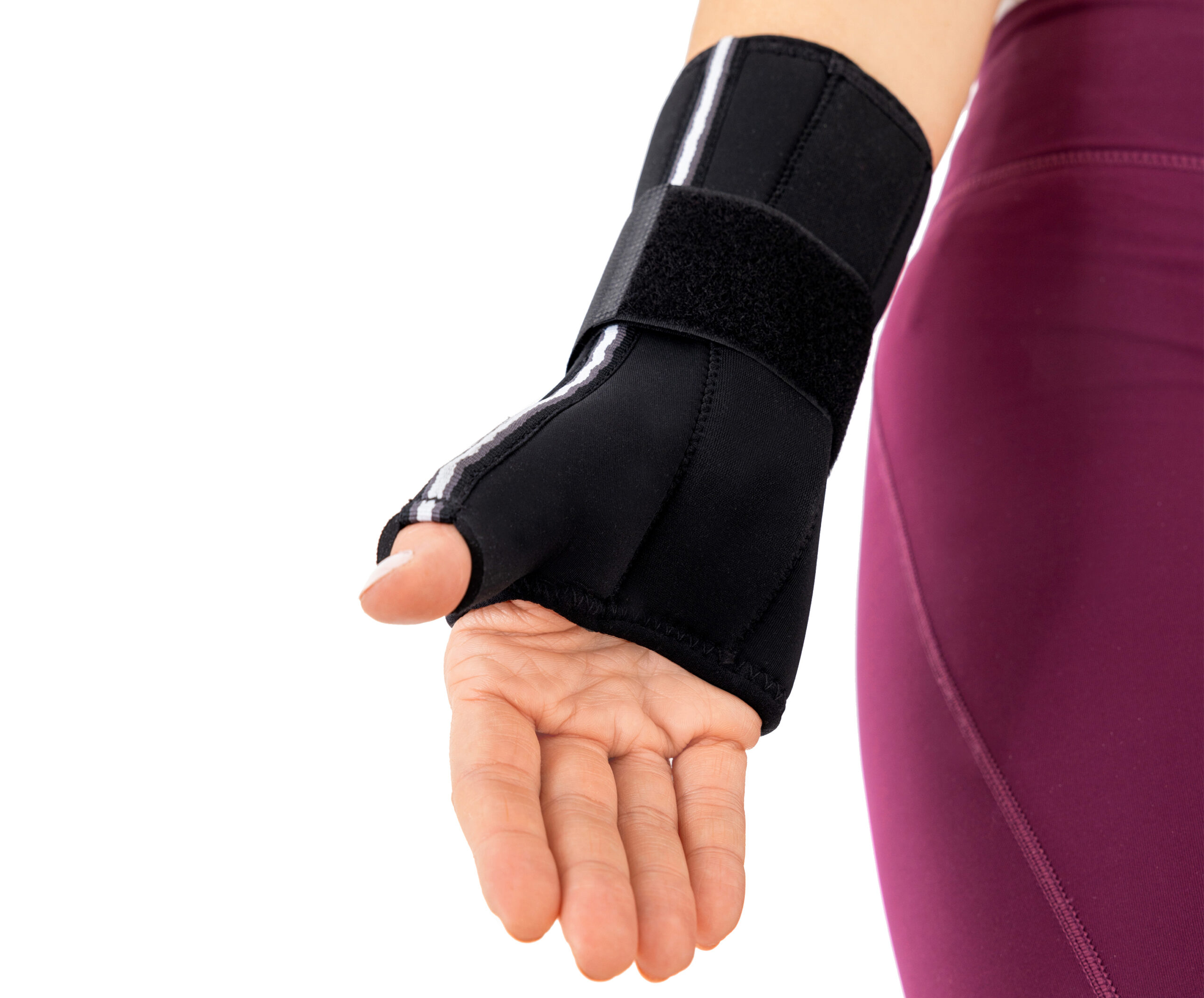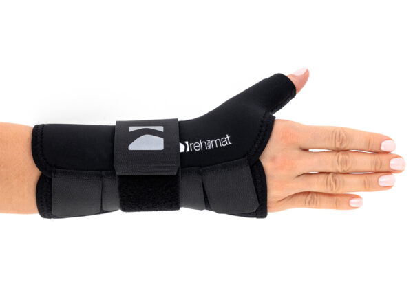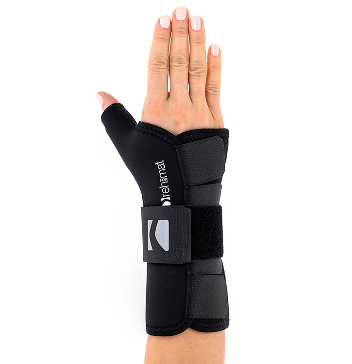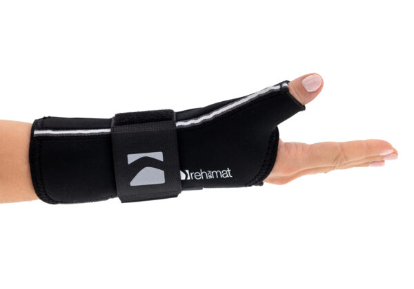 Delikatne boczne usztywnienie kciuka stabilizuje staw siodełkowy w pozycji neutralnej, zapobiega przywiedzeniu kciuka i przyspiesza regenerację więzadeł.