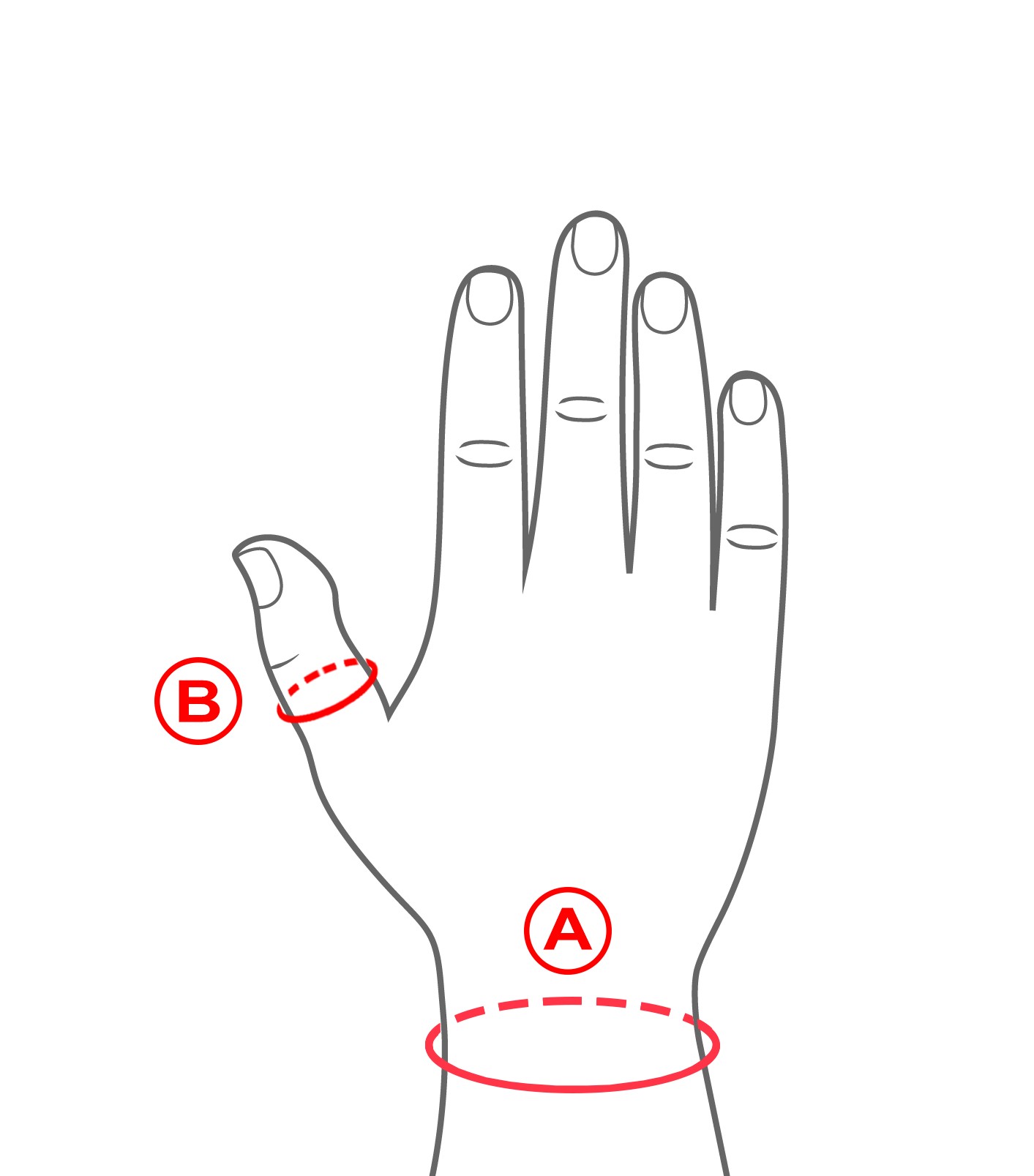 | Rozmiar | Obwód nadgarstka (A) | Obwód w stawie między paliczkowym kciuka (B) | Sposób dokonywania pomiaru |