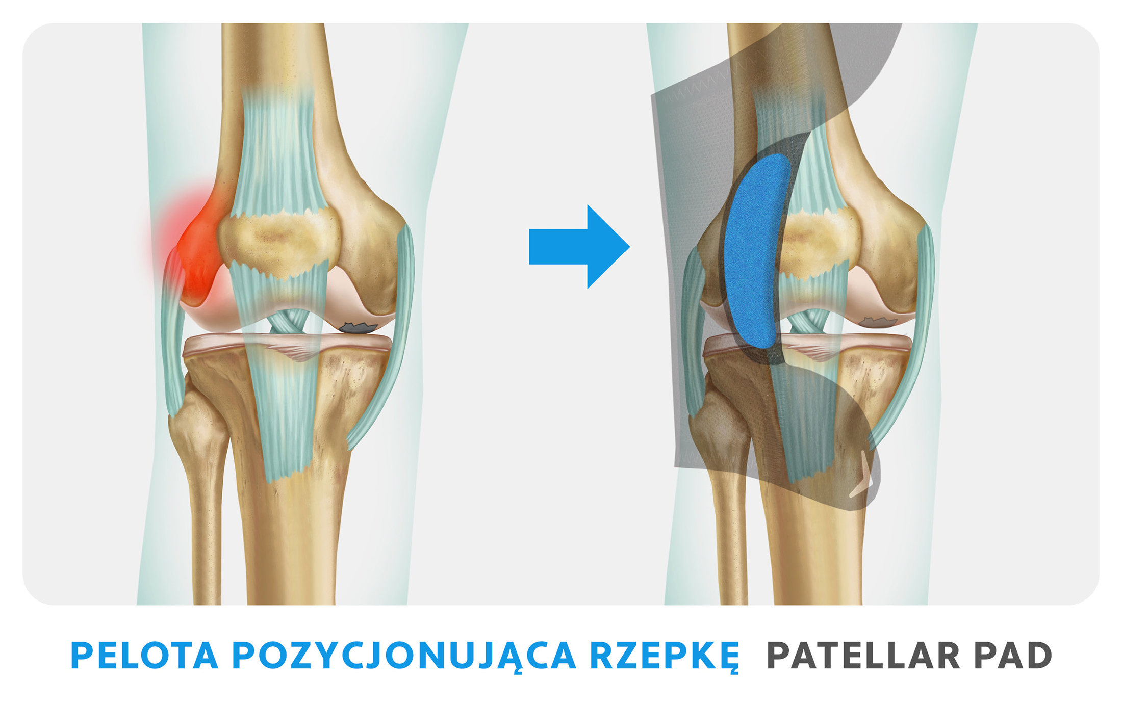 Od strony przyśrodkowej zastosowano specjalistyczną pelotę pozycjonującą rzepkę, która ma na celu jej fizjologiczne ustawienie w osi stawu, poprawia ruch zgięcia i wyprostu kolana i zapobiega zwichnięciu rzepki.