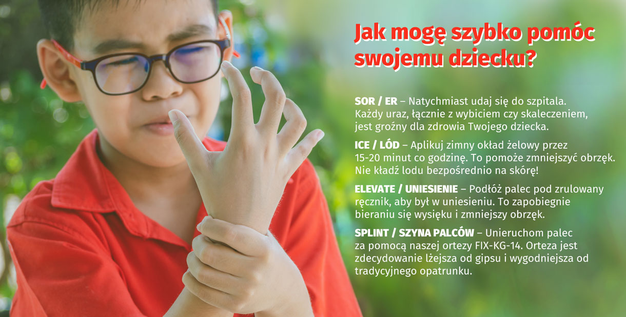 Spośród wszystkich urazów, złamania, wybicia i inne uszkodzenia w obrębie palców są jednymi z najczęstszych wśród dzieci. Czasami wystarczy zatrzaśnięcie paliczka palców w drzwiach lub upadek na rękę, który niejednokrotnie kończy się wybiciem palca czy właśnie złamaniem. Sport i aktywność fizyczna jest również jednym z wielu czynników powodujących urazy w obrębie dłoni i stanowi 50% wszystkich przypadków. Warto pamiętać, że dziecięce kości są zgoła odmienne od kości dorosłych. Ich konsystencja jest zupełnie inna. Młodsze kości są bardziej gibkie, niczym młode gałązki drzew, a z wiekiem twardnieją i tracą na swojej elastyczności. Dlatego, postępowanie ze złamaniami i urazami wśród dzieci całkowicie różni się od leczenia urazów wśród dorosłych. Gdy dochodzi do urazu, palce dziecka są bolesne, spuchnięte i mało mobilne. W takim przypadku należy natychmiast zgłosić się do szpitala w celu zdiagnozowania problemu. Złamanie i urazy w obrębie palców zazwyczaj leczy się za pomocą unieruchomienia. W tym celu najlepsza będzie nasza pediatryczna orteza szynowa palca FIX-KG-14.