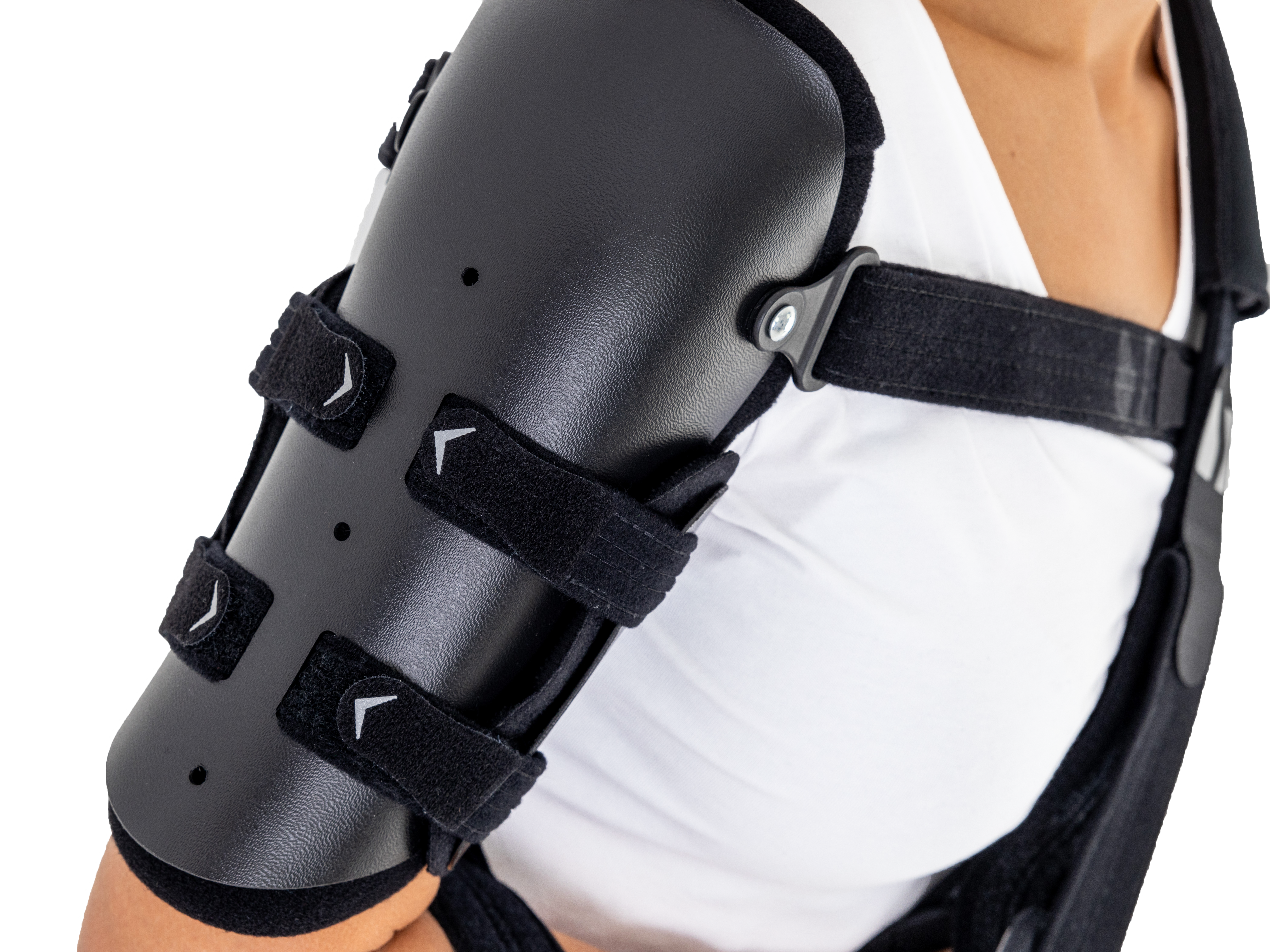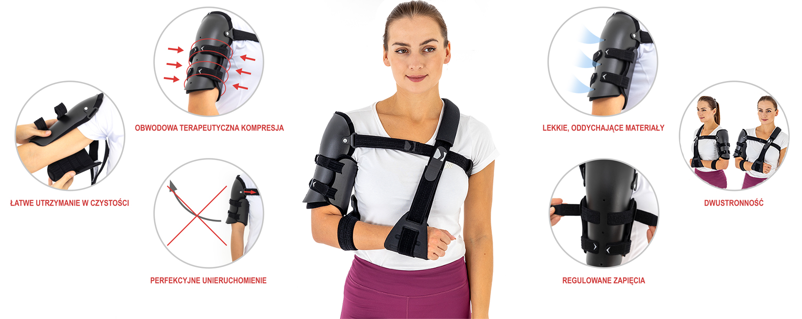 Orteza ramienia MASTER-01 to doskonała alternatywa tradycyjnego ciężkiego opatrunku gipsowego. Orteza składa się z lekkich łusek o anatomicznym kształcie oraz stabilizujących pasów obwodowych, które doskonale utrzymują kości w pożądanej pozycji zapewniając idealne warunki do leczenia. Orteza barku MASTER-01 doskonale stabilizuje kość ramienną w przypadku złamań jej trzonu, pozostawiając łokciowi i ręce możliwość pełnej ruchomości i zapobiegając przykurczom. Orteza MASTER-01 zapewnia stabilizację kości ramiennej na niemalże całej jej długości. Łuskowa budowa ortezy pozwala na zapewnienie obwodowej kompresji mięśniom i tkankom miękkim i zapewnia prawidłowe warunki do leczenia. System łusek barkowych to anatomicznie wyprofilowane łuski ortopedyczne 3D wykonane z cienkiego ABS, który z łatwością dopasowuje się do kształtu kończyny. Są one w pełni perforowane, dzięki czemu doskonale dotleniają skórę użytkownika. Zestaw składa się z zewnętrznej i wewnętrznej łuski ramienia. W łuskach zamontowano klamry obrotowe oraz system wycięć na pasy obwodowe. Od wewnątrz łuski posiadają zapięcia Velcro, pozwalające na dopięcie do nich od spodu miękkich poduszek odciążających 3D. Łuski doskonale obejmują cały staw ramienny wraz z kością ramienną, dopasowują się do anatomicznych kształtów kończyny, zapewniając profesjonalne unieruchomienie. Dzięki swojej niewielkiej wadze, orteza MASTER-01 stabilizuje kończynę pacjenta bez sprawiania mu dyskomfortu. Wnętrze łusek barkowych zostało wyścielone przyjaznym dla skóry termoformowanym surowcem Active3D™. Do łusek zamontowany został pas obwodowy, który przebiega przez klatkę piersiową i stabilizuje ramię, zapobiegając jego niekontrolowanemu odwiedzeniu. Takie rozwiązanie dostarcza najwyższy poziom stabilizacji i unieruchomienia kończyny, niezbędny w przypadku złamań kości. Pas obwodowy został wykonany z miękkiego surowca oraz posiada szeroki zakres regulacji obwodowej. Dodatkowo, został on wyposażony w pachową osłonę odciążającą i zwiększającą komfort użytkowania. Osłona odciążająca została wykonana przyjaznego dla skóry miękkiego surowca SoftComfort™. Nasza łuskowa orteza barku MASTER-01 może być również stosowana w okresie pooperacyjnym, jako zabezpieczenie ramienia przed urazem. Innowacyjna konstrukcja ortezy sprawia, że może być ona stosowana zarówno na prawą jak i lewą rękę.