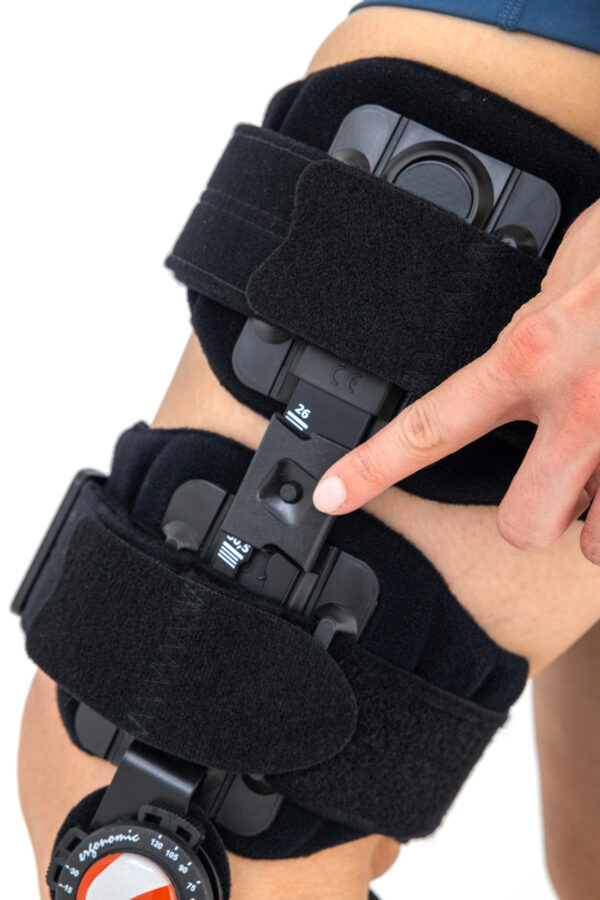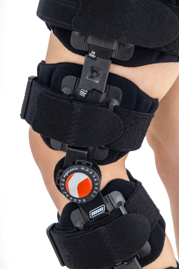 Nasza orteza jest wyrobem bardzo lekkim o ażurowej konstrukcji, co zdecydowanie ułatwia użytkowanie jej po operacji. Wyposażono ją w dwie monocentryczne szyny boczne z regulacją kąta zgięcia i wyprostu. Szyny wykonano z wysokiej jakości stopu aluminium i pokryto na gorąco trwałą powłoką proszkową. Układ szyn w aparacie i ich kształt gwarantują anatomiczne przyleganie wyrobu do zabezpieczonej kończyny i pozwalają na uzyskanie doskonałej stabilizacji zabezpieczonego stawu.