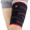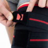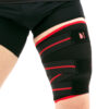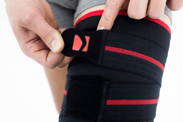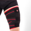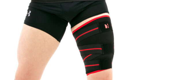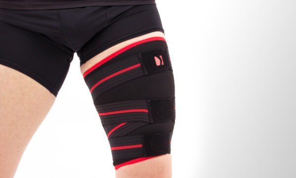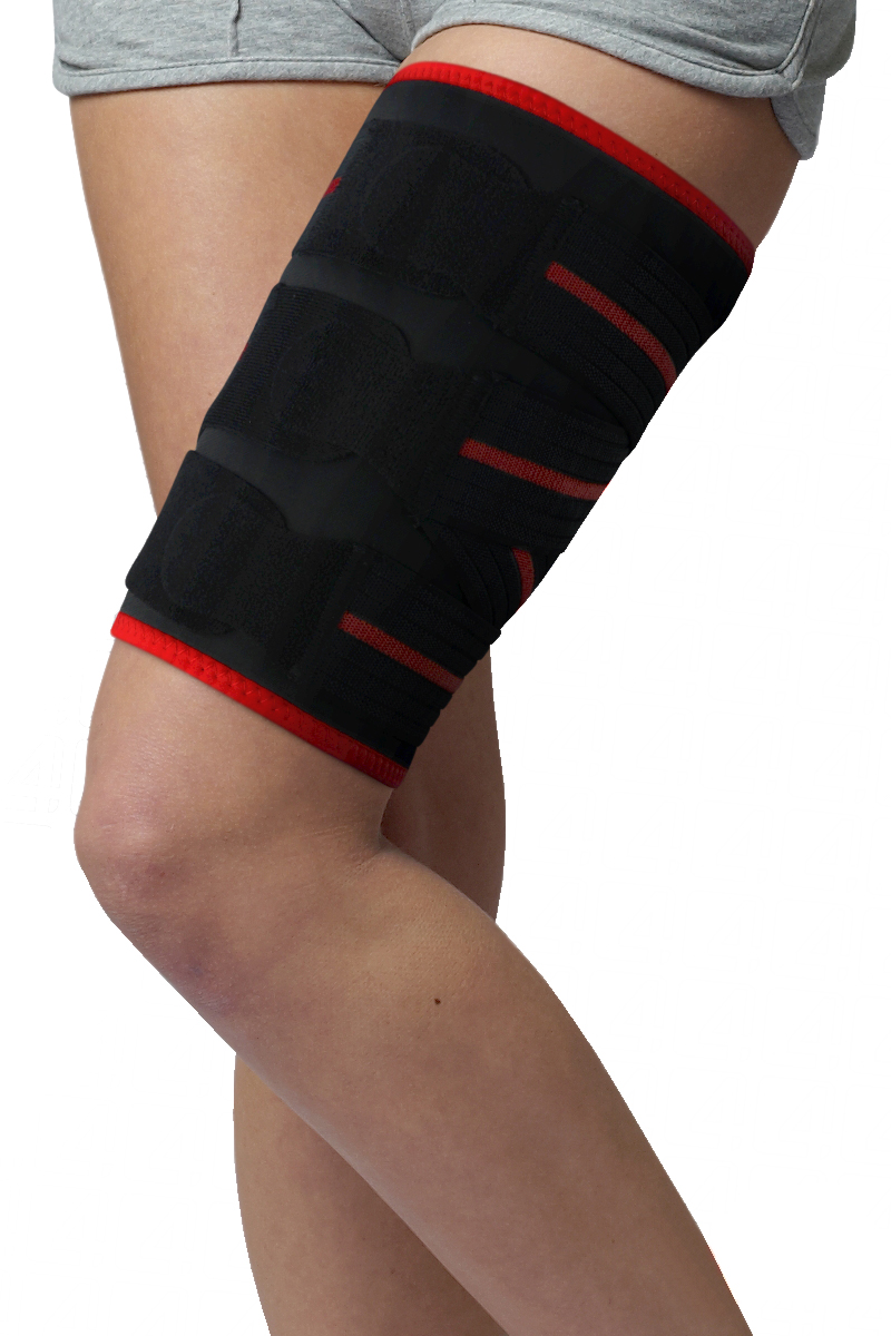 Anatomicznie ukształtowana opaska uda wyposażona w potrójny system taśm kompresyjnych wyposażonych w zapiecia Velcro.