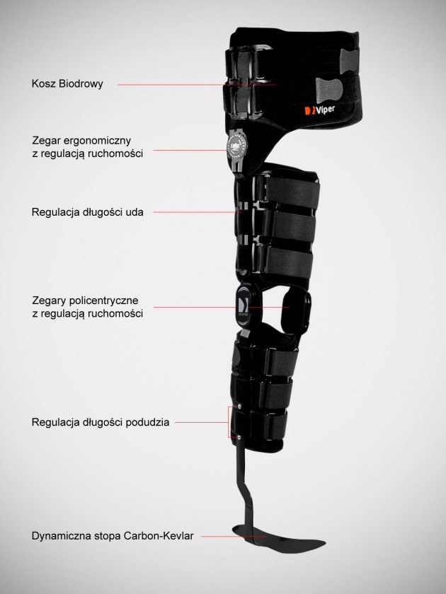 W stawie biodrowym zastosowano jednoosiowy zegar ergonomiczny z regulacją kąta zgięcia i wyprostu co 15 stopni, w stawie kolanowym dwuosiowy zegar policentryczny z regulacją kata zgięcia co 20 stopni, w stawie skokowym zaś standardowo występuje konstrukcja bezprzegubowa. Na życzenie klienta w stawie skokowym możemy zamontować zegar ortopedyczny 1R, z regulacją ustawienia kąta zgięcia i wyprostu stopy co 15 stopni. Każdy z tych zegarów może zostać zablokowany na żądanym przez lekarza lub terapeutę kącie zgięcia. Każdy z zegarów posiada funkcję blokady danego ustawienia przed nieuprawnionym lub przypadkowym jej przestawieniem.