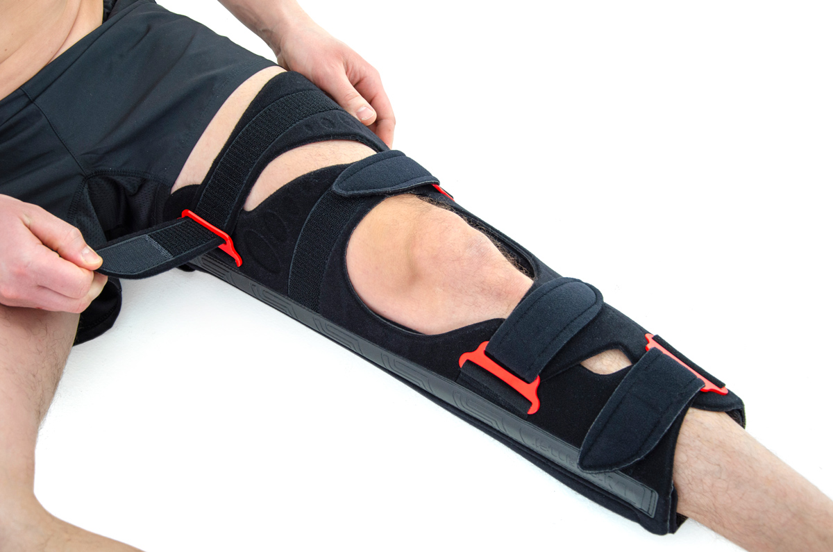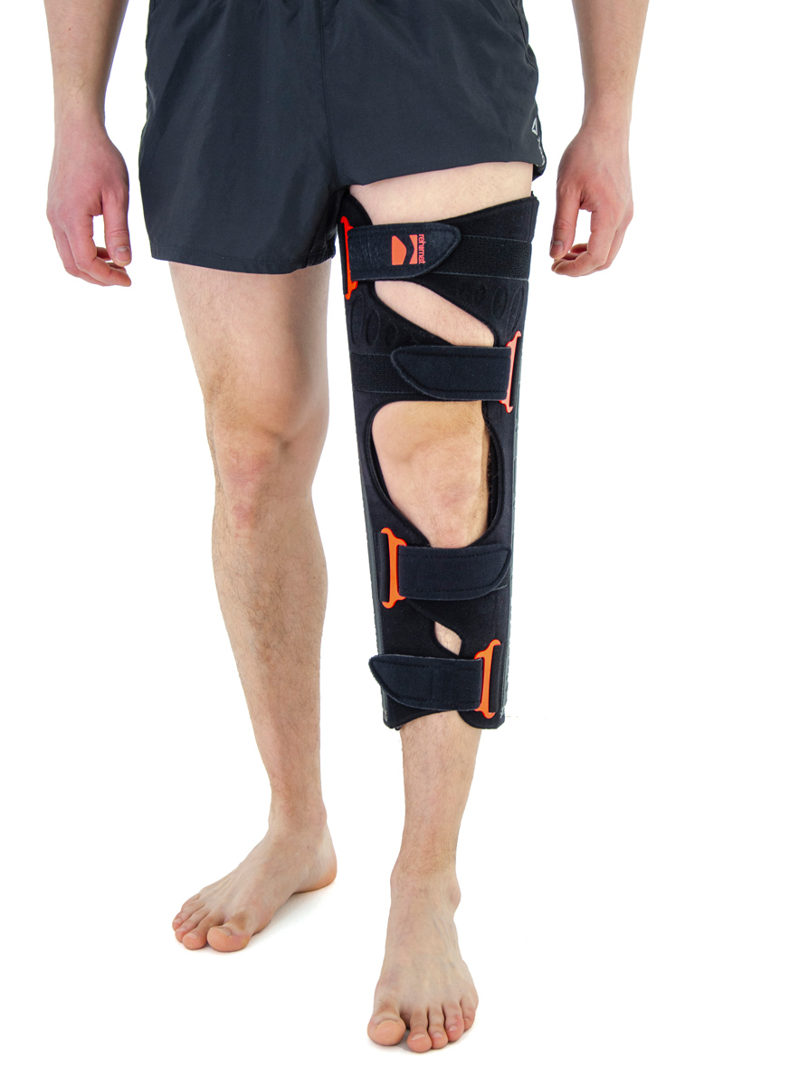 Orteza unieruchamiająca kończynę dolną w wyproście OKD-03, konstrukcja wyrobu umożliwia indywidualne, łatwe i precyzyjne dopasowanie wyrobu do ciała pacjenta oraz zapewnia pewną stabilizację kończyny.