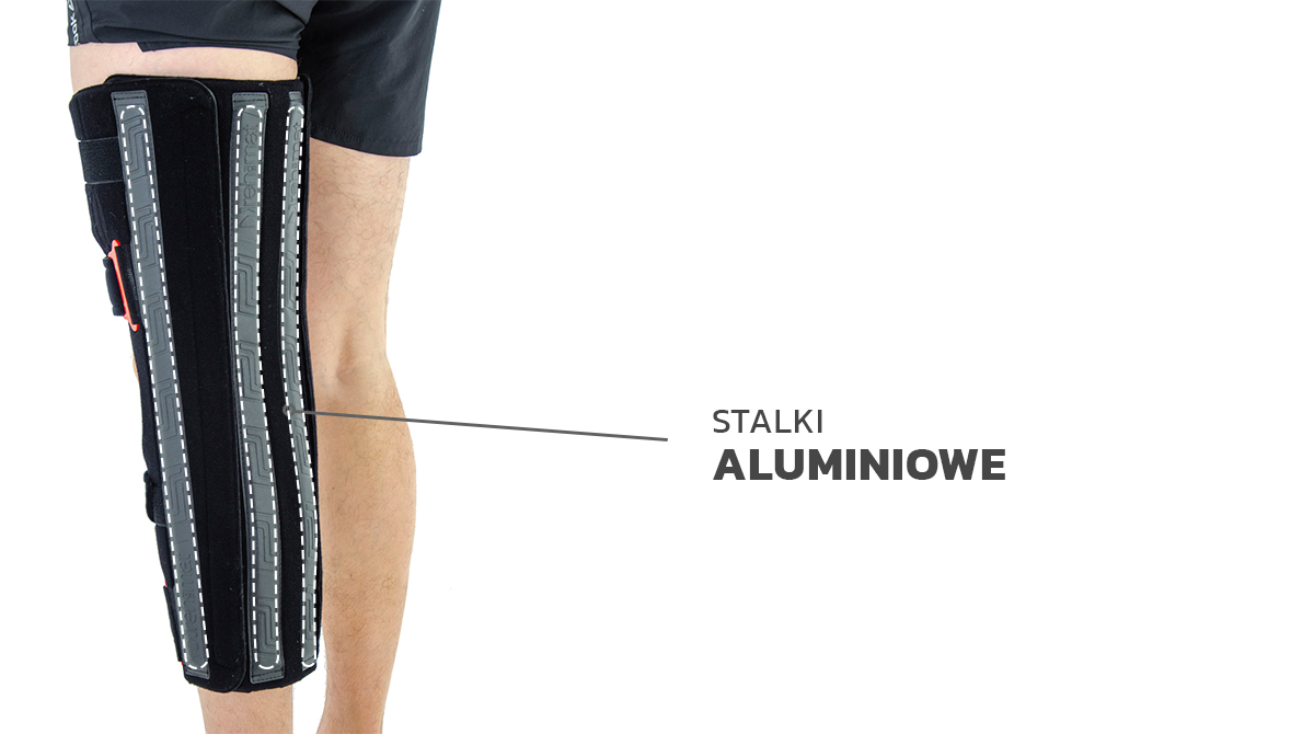 - system anatomicznie wyprofilowanych aluminiowych szyn bocznych z zespołem niezależnego mocowania do rękawa ortezy zapewniający pewną stabilizację.