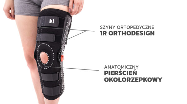 Orteza OKD-07 została wykonana z innowacyjnego, surowca ProSix™. Konstrukcja ortezy jest projektem unikatowym, łączącym w sobie zarówno funkcje ortez otwartych – łatwość zakładania wyrobu poprzez brak konieczności wciągania ortezy przez stopę, jak również zamkniętych – pełna stabilizacja rzepki i stawu kolanowego. W tym celu w wyrobie zainstalowano anatomicznie ukształtowany pierścień rzepki. Dodatkowo orteza posiada otwarty dół podkolanowy, co zdecydowanie zwiększa komfort użytkowania wyrobu i poprawia odprowadzanie potu od kończyny. Ortezę OKD-07 wyposażono w cztery komplety pasów obwodowych oraz plastikowe uchwyty szyn ortopedycznych. W wyrobie zastosowano szyny 1R orthodesign. Szyny te, to nowatorskie podejście do tematyki szyn ortopedycznych z regulacją kąta zgięcia i wyprostu.