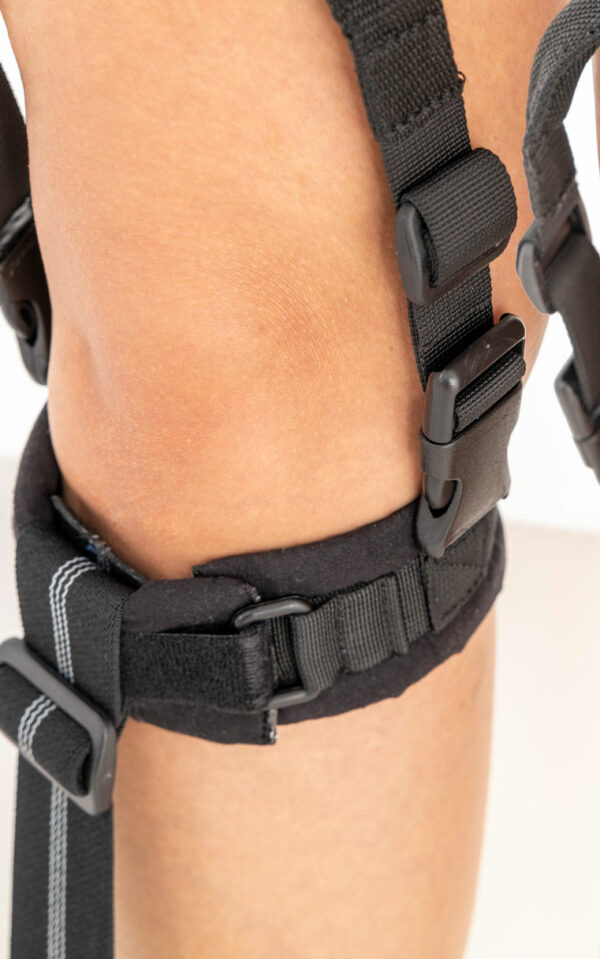 Orteza kończyn dolnych OKD-10 DUAL składa się z pasa nośnego, dynamicznej części udowej, opaski podrzepkowej oraz gumy unoszącej stopę.