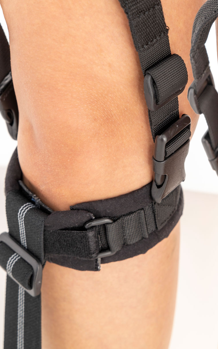 Strzemię kolanowe zostało pokryte taśmą nośną, która jest bardzo wytrzymała na obciążenia. Część udowa wraz ze strzemieniem kolana montowana jest do opaski podrzepkowej za pomocą klamerki mocującej. Opaska ta wyścielona została antypoślizgowym silikonem, który zapobiega jej przemieszczaniu się w trakcie użytkownika.