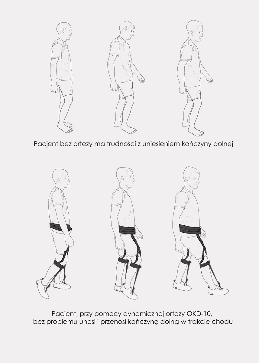 Innowacyjna konstrukcja ortezy wspomagającej unoszenie kończyn dolnych OKD-10 DUAL ułatwia użytkownikowi poruszanie się nawet przy dużym osłabieniu siły mięśniowej i sztywności mięśni. Orteza działa naprzemiennie na obie nogi, ułatwia zgięcie kolana i przetaczanie stóp w trakcie chodu.