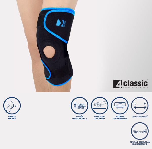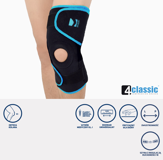 Orteza stawu kolanowego OKD-18 należy do grupy 4classic i jest wyrobem uniwersalnym – bezrozmiarowym. Orteza została wykonana z surowca UniPren™. Orteza kolana OKD-18 została wykonana w formie otwartej, ułatwiającej zakładanie i dopasowanie wyrobu. Cechuje się ona miękkością i wysoką elastycznością, co zdecydowanie ułatwia przyleganie wyrobu do kończyny i gwarantuje właściwą kompresję zabezpieczonego stawu. Orteza ma działanie kompresyjne, przez co zmniejsza wysięki, niweluje obrzęki i działa przeciwbólowo. Anatomicznie wyprofilowany pierścień doskonale stabilizuje rzepkę i zapobiega jej zwichnięciu. Dodatkowo, ortezę wyposażono w system bocznych szyn ortopedycznych z funkcją regulacji ruchomości stawu co 15 stopni. Orteza kolana OKD-18 to doskonałe rozwiązanie dla osób ceniących sobie komfort i skuteczność wyrobu.