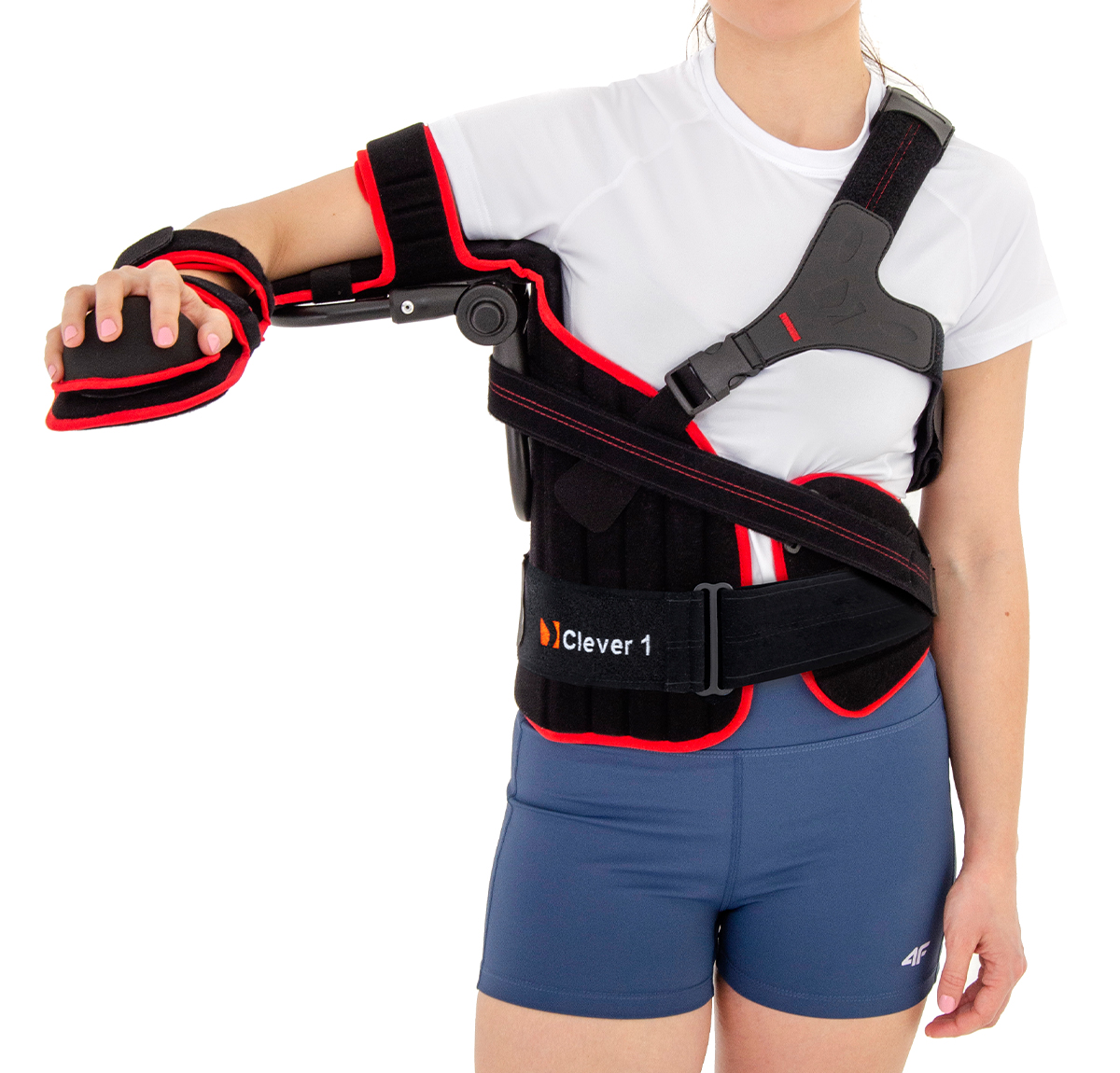 Nasze nowe urządzenie to skuteczna pomoc dla uszkodzonego stawu barkowego, lub stawu barkowego po przebytej operacji. Aparat odwodzący kończynę górną z regulacją odwiedzenia AM-AO-KG-01 o nazwie CLEVER 1, może być oferowany do sprzedaży przez, lub na zlecenie lekarza, lub innego wykwalifikowanego specjalisty medycznego – np. terapeuty. Najnowsze badania naukowe udowodniły, iż w przypadkach przedniego zwichnięcia barku wskazane jest ustawienie stawu barkowego w rotacji zewnętrznej. Wyrób składa się z platformy kończyny górnej wyposażonej w dwie taśmy obwodowe przedramienia, jedną taśmę ramienną oraz podparcie dłoni. Podparcie dłoni wyposażono w regulację wysokości. Do stabilizacji wyrobu na ciele pacjenta służy podwójny pas obojczykowo-piersiowy. Pas ten wyposażony jest w przednią klamrę, dzięki której pacjent łatwo może zdjąć aparat, bez konieczności powtórnego ustawiania długości pasów mocujących. Pasy te posiadają uniwersalną konstrukcję, polegającą na tym, że zbędną ich część można odciąć w celu łatwiejszego dopasowania wyrobu. Dodatkowo dla poprawy komfortu użytkowania wyposażono je w neoprenowe ochraniacze. Platformę w sposób elastyczny połączono z boczną pelotą tułowia, wyposażoną w dziesięć fiszbin ortopedycznych z tworzywa sztucznego. Taka konstrukcja peloty umożliwia jej elastyczność w płaszczyźnie pionowej, gwarantując zarazem właściwą sztywność w płaszczyźnie poziomej wyrobu. Jako element stabilizujący kończynę zastosowano innowacyjny przegub skokowy o kątach odwiedzenia ramienia 0, 15, 30, 60, 75, 90. Ustawienie właściwego kąta odbywa się bez użycia jakichkolwiek narzędzi. W celu zabezpieczenia wyrobu przed przypadkowym przestawieniem ustawionego kąta, zastosowano zasadę, polegającą na konieczności jednoczesnego wciśnięcia dwóch przycisków zmieniających kąt przegubu. Do stabilizacji wyrobu na ciele pacjenta służy szeroki pas biodrowy oraz dodatkowo wyrób wyposażono w zestaw składający się z półsztywnej poduszki biodrowej oraz taśm odwodzących. Dla ułatwienia montażu, zestaw został oznaczony kolorem czerwonym. Dzięki zastosowaniu tego zestawu istnieje możliwość płynnej regulacji kąta rotacji ramienia w stawie ramiennym.