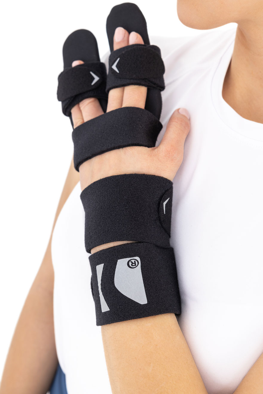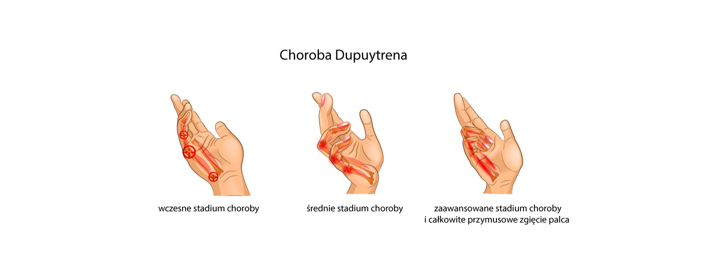 Choroba Dupuytrena to deformacja stawów ręki niewiadomego pochodzenia, która rozwija się latami. Może być dziedziczna. Polega ona na tworzących się pod skórą, na skutek stanów zapalnych, zgrubień i zwłóknień tkanek miękkich, które z czasem powodują przymusowe ustawienie palców dłoni w pozycji zgięciowej. Takie przymusowe zgięcie palców ręki i brak możliwości ich wyprostowania powoduje unieruchomienie dłoni i brak umiejętność wykonywania czynności dnia codziennego tj. ubieranie, mycie czy gotowanie. W przypadku zaawansowanego stadium choroby najczęstszą formą leczenia jest zabieg chirurgiczny, polegający na usunięciu tkanki powodującej przykurcz. Niestety, schorzenie ma charakter przewlekły i zgrubienia tkanek często powracają. Dlatego, dobrym sposobem na pasywne rozciąganie tkanek i zapobieganie ich przykurczom jest nasza szynowa orteza palców OKG-14. Choroba Dupuytrena