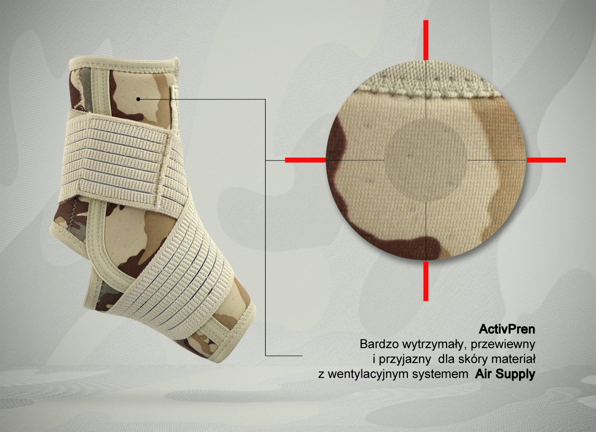 Orteza 4Army-SS-01 to anatomiczna orteza stawu skokowego z pasami krzyżowymi. Wyrób został wykonany ze wzmocnionego surowca ACTIV PREN, charakteryzującego się dużą wytrzymałością, miękkością i wysoką elastycznością, co zdecydowanie ułatwia przyleganie wyrobu do kończyny i gwarantuje właściwą kompresję zabezpieczonego stawu.