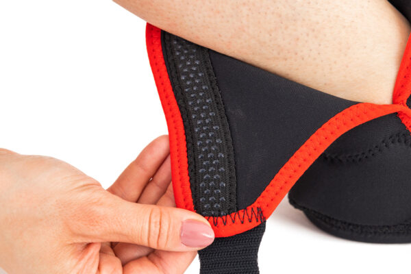 Orteza jest bardzo łatwa do zakładania, a dzięki silikonowym wzmocnieniom nie przemieszcza się w trakcie chodzenia.  Wyrób posiada anatomiczny kształt i stabilizujący wpływ na mięśnie.