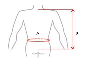 | Rozmiar | Obwód pasa ( A ) | Odległość od Th3 do kości ogonowej ( B ) | Odpowiedni dla wieku | Sposób dokonywania pomiaru |