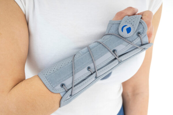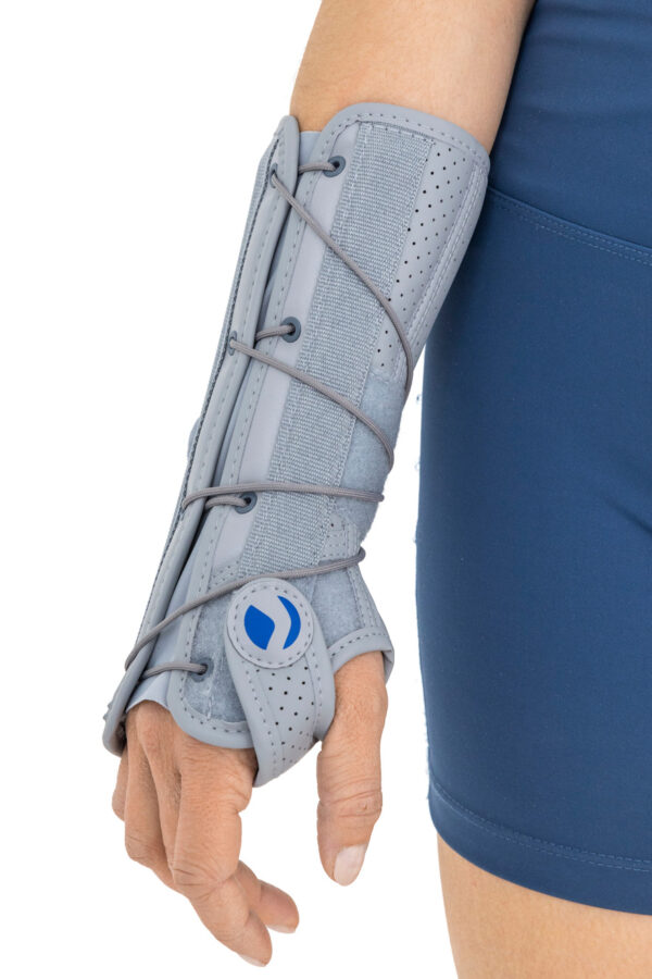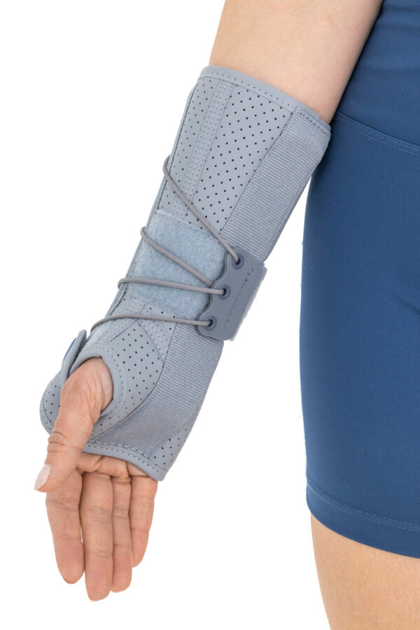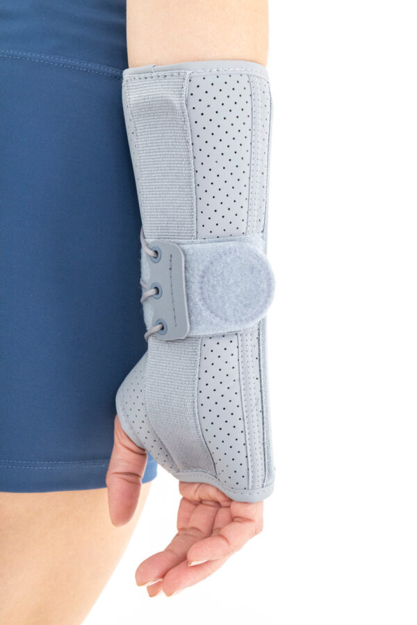 Sznurowana orteza nadgarstka została wykonana według nowego bardziej anatomicznego kształtu, dzięki czemu lepiej stabilizuje staw promieniowo-nadgarstkowy i nadgarstek. W górnej części wyrobu zainstalowano dwie fiszbiny z tworzywa sztucznego, które wraz z łyżką dłoniową przekrojowo tworzą trzy obwodowe punkty podparcia kończyny górnej. Taki sposób stabilizacji przedramienia jest sposobem najbardziej skutecznym. Orteza została w całości wykonana z nowego innowacyjnego surowca AirSanmed II™. W dłoniowej części ortezy zainstalowano miękką elastyczną poduszkę poprawiającą komfort użytkowania wyrobu. Konstrukcja ortezy oraz użyte surowce przeciwdziałają wystąpieniu u jej użytkowników zespołu cieśni nadgarstka. W dolnej części wyrobu zastosowano anatomicznie wyprofilowaną szynę dłoniową, która galwanicznie została zabezpieczona przed działaniem ludzkiego potu. Mocowanie wyrobu na kończynie odbywa się przy użyciu zespołu sznurowanego wraz z zapięciem oraz jednej wąskiej taśmy dłoniowej. Zakres regulacji zapięcia jest bardzo duży i dzięki temu gwarantuje on duże możliwości regulacji i stabilizacji.