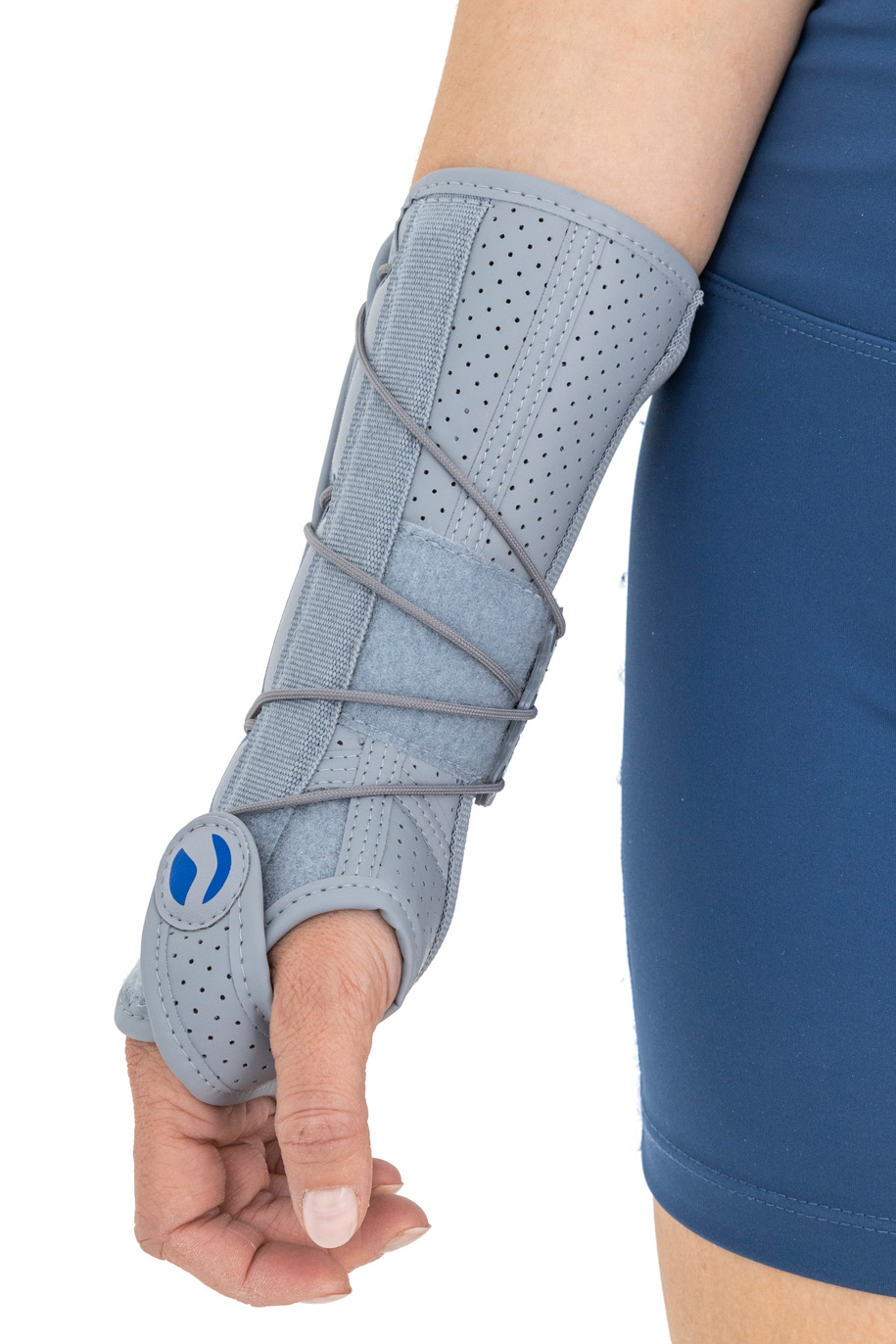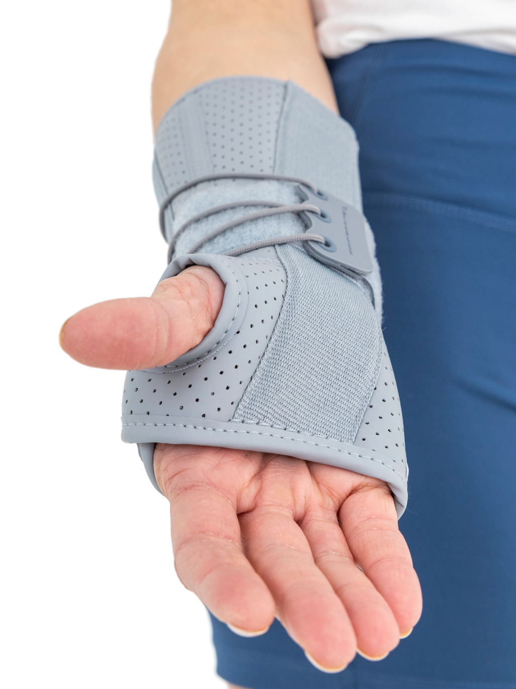 Sznurowana orteza nadgarstka została wykonana według nowego bardziej anatomicznego kształtu, dzięki czemu lepiej stabilizuje staw promieniowo-nadgarstkowy i nadgarstek. W górnej części wyrobu zainstalowano dwie fiszbiny z tworzywa sztucznego, które wraz z łyżką dłoniową przekrojowo tworzą trzy obwodowe punkty podparcia kończyny górnej. Taki sposób stabilizacji przedramienia jest sposobem najbardziej skutecznym. Orteza została w całości wykonana z nowego innowacyjnego surowca AirSanmed II™. W dłoniowej części ortezy zainstalowano miękką elastyczną poduszkę poprawiającą komfort użytkowania wyrobu. Konstrukcja ortezy oraz użyte surowce przeciwdziałają wystąpieniu u jej użytkowników zespołu cieśni nadgarstka. W dolnej części wyrobu zastosowano anatomicznie wyprofilowaną szynę dłoniową, która galwanicznie została zabezpieczona przed działaniem ludzkiego potu. Mocowanie wyrobu na kończynie odbywa się przy użyciu zespołu sznurowanego wraz z zapięciem oraz jednej wąskiej taśmy dłoniowej. Zakres regulacji zapięcia jest bardzo duży i dzięki temu gwarantuje on duże możliwości regulacji i stabilizacji.