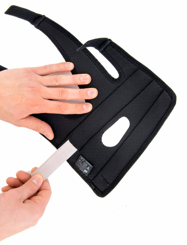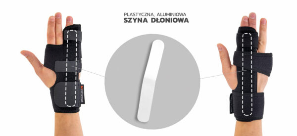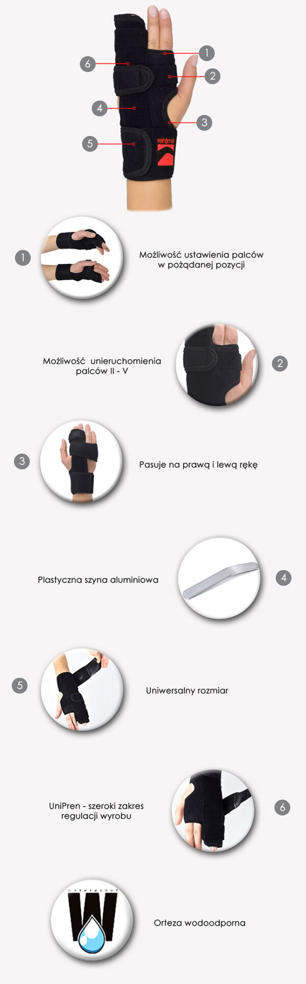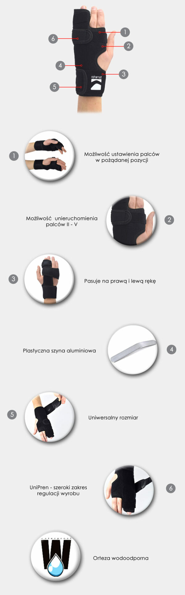 Orteza AM-SP-01 jest wyrobem wodoodpornym, więc z powodzeniem można ją użytkować w środowisku wodnym, a także w celu utrzymania czystości, prać ręcznie lub myć pod wodą bieżącą. Orteza posiada plastyczną aluminiową szynę dłoniową, która stabilizuje zabezpieczone palce dłoni. Orteza posiada dwa niezależne kanały na szynę i, w zależności od rodzaju schorzenia, szynę można wsuwać w dowolny kanał ortezy, otrzymując unieruchomienie konkretnego palca. Nasza modelowana szyna może być w łatwy sposób kształtowana przez lekarza, w celu ustawienia pożądanego w danym procesie leczenia poziomu zabezpieczenia palców.
