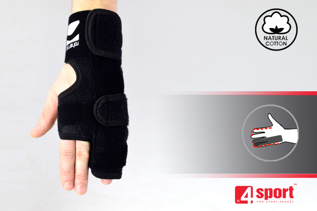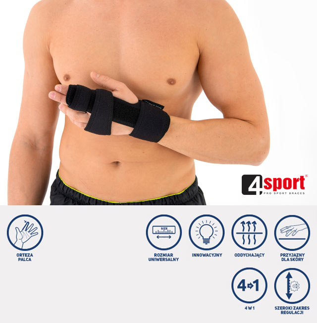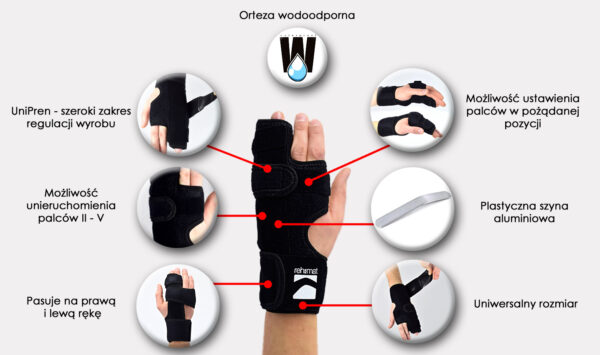Orteza AM-SP-01 jest ortezą uniwersalną, może być stosowana na każdy rozmiar dłoni, zarówno na prawą jak i lewą rękę oraz może zabezpieczać każdy palec, z wyłączeniem kciuka.