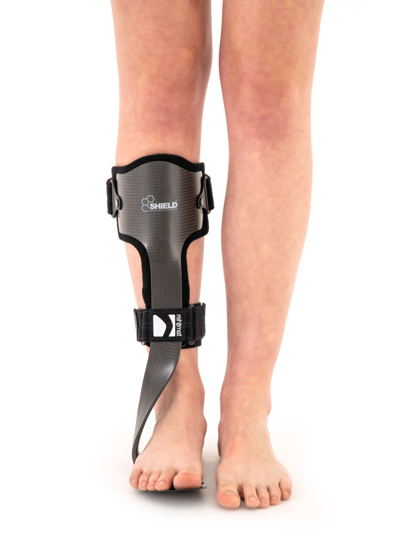Po stronie grzbietowej ortezy zastosowano wąską aluminiową stalkę, która zapewnia dodatkową grzbietową stabilizację kończyny.