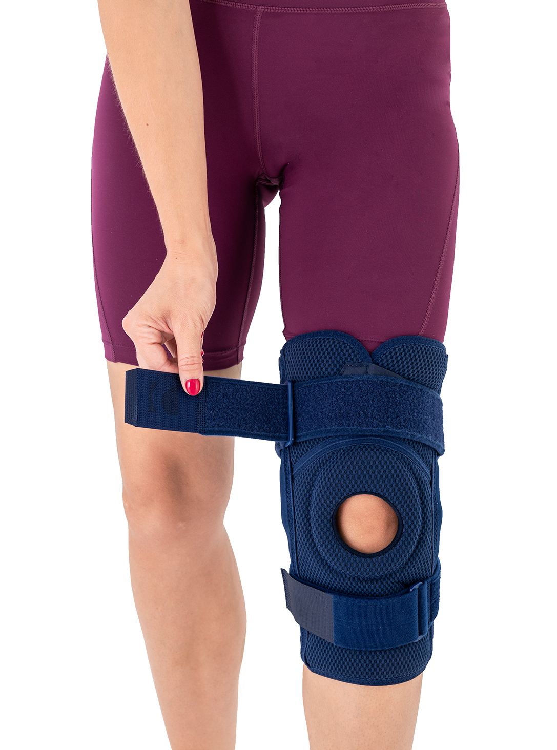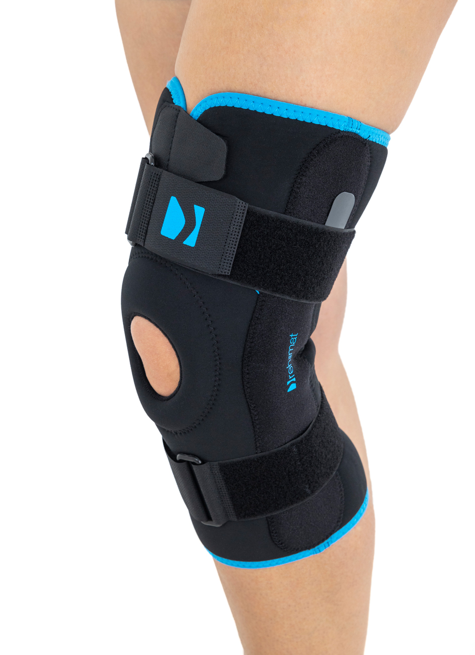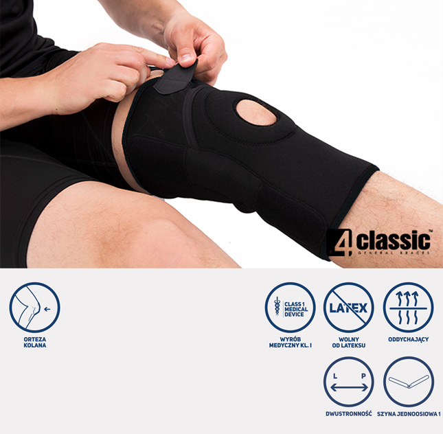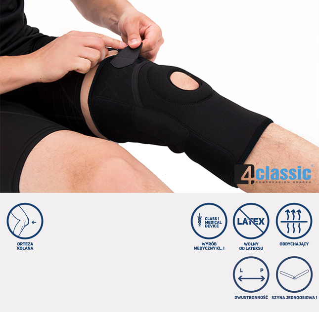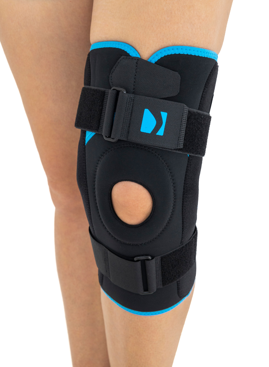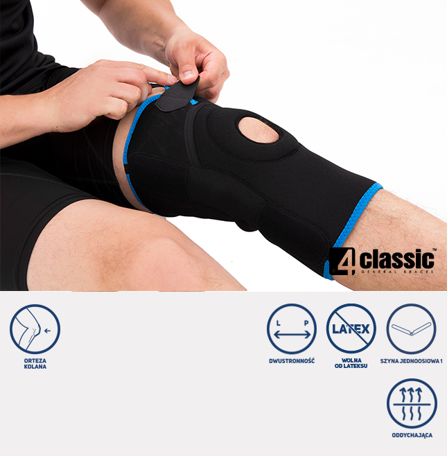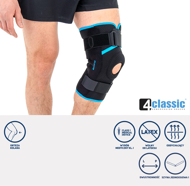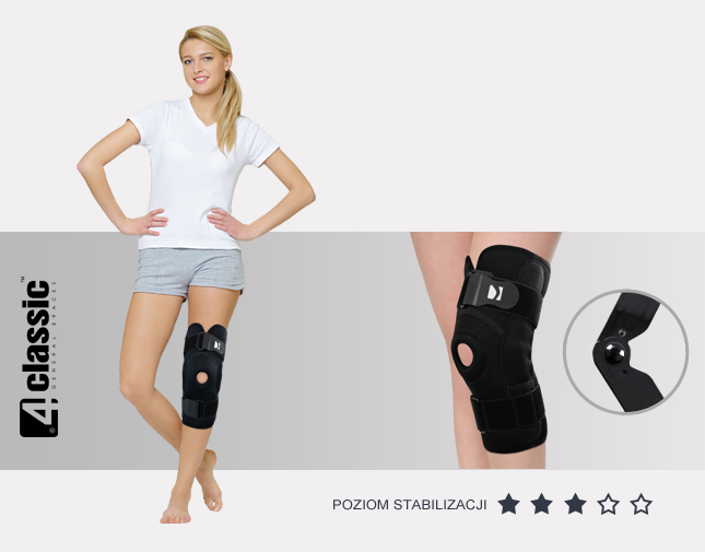 Orteza typu zamkniętego, wykonana z perforowanej pianki neoprenowej, dwustronnie pokrytej tkaniną okładkową. Posiada dwa niezależne zespoły pasów wzmacniających wykonane z taśm VELCRO. Wyrób wyposażono w jednoosiowe szyny boczne, wykonane z wysokiej jakości tworzywa sztucznego zbrojonego włóknami węglowymi. Układ szyn w ortezie oraz ich specyficzna elastyczność, powoduje właściwe przyleganie wyrobu do zabezpieczonej kończyny i pozwala na uzyskanie doskonałej stabilizacji zabezpieczonego stawu. Tak precyzyjna regulacja wyrobu zdecydowanie ułatwia proces rehabilitacji uszkodzonego stawu kolanowego.