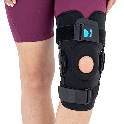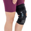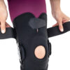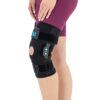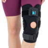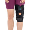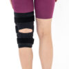 Orteza stawu kolanowego, zamknięta, wykonana z ACTIV PREN, wyposażona w dwuosiowe szyny boczne bez regulacji, mechanizm zębatkowy oraz anatomicznie wyprofilowany pierścień stabilizujący rzepkę.