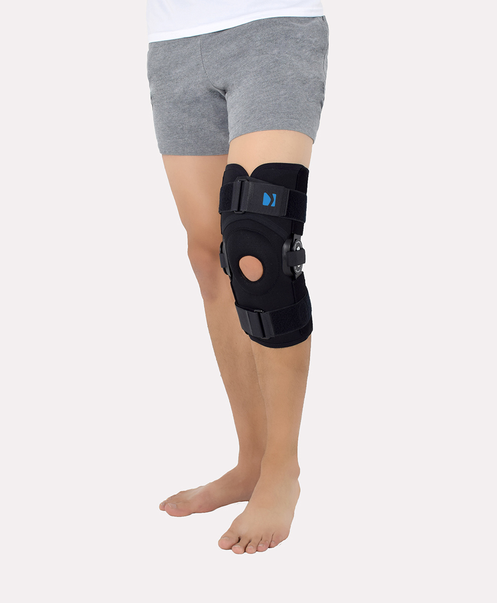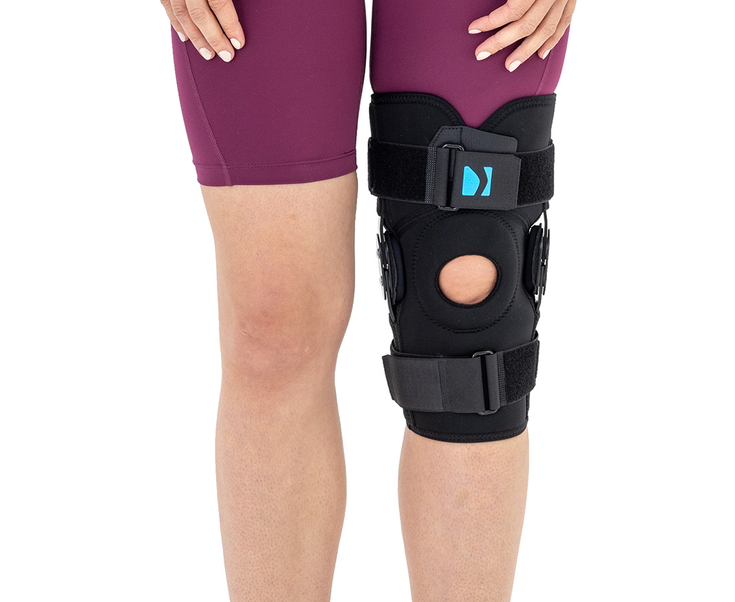 Orteza stawu kolanowego, zamknięta, wykonana z ACTIV PREN, wyposażona w dwuosiowe szyny boczne bez regulacji, mechanizm zębatkowy oraz anatomicznie wyprofilowany pierścień stabilizujący rzepkę.