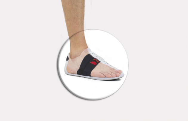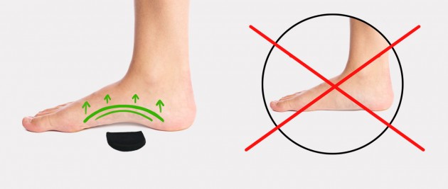 Obwodowy ucisk ściągacza ortezy i wyjmowana pelota na płaskostopie prowadzą do podniesienia śródstopia w kierunku fizjologicznego sklepienia stopy.