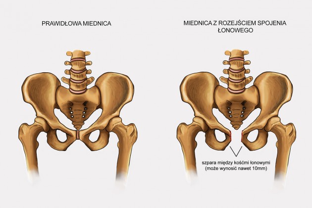 Rozejście spojenia łonowego jest zaś skutkiem nadmiernego rozluźnienia więzadeł i zwiększenia ruchliwości kości miednicy pod wpływem hormonów ciążowych (estrogenów). Hormony te wpływają zarówno na chrząstkozrost łonowy jak i stawy krzyżowo-biodrowe. Pojawia się ból w trakcie chodzenia („kaczy chód”), a niekiedy słyszy się nawet w trakcie chodzenia charakterystyczne trzaski. Niemożliwe staje się stanięcie na jednej nodze. Do rozejścia się spojenia łonowego (jak również jego pęknięcia a nawet rozerwania) może dojść w trakcie trudnego porodu, gdy istnieje niewspółmierność porodowa lub konieczne było użycie kleszczy.