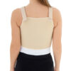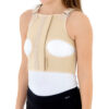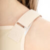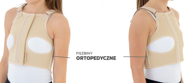 W bocznej części ortezy zastosowano usztywnienia w formie fiszbin ortopedycznych. Fiszbiny przejmują część działających sił zewnętrznych równomiernie rozprowadzając kompresję ortezy, odciążając tym samym mięśnie oraz zapobiegając zwijaniu się pasa, co poprawia komfort użytkowania. Orteza została wyposażona w przednie zapięcie z funkcją regulacji obwodu, dzięki czemu wyrób dokładniej dopasowuje się do każdej sylwetki. Dodatkowo orteza posiada regulowane szelki, które pozycjonują wyrób na ciele, zapobiegając zsuwaniu i przekręceniu pasa nie ograniczając przy tym ruchów.