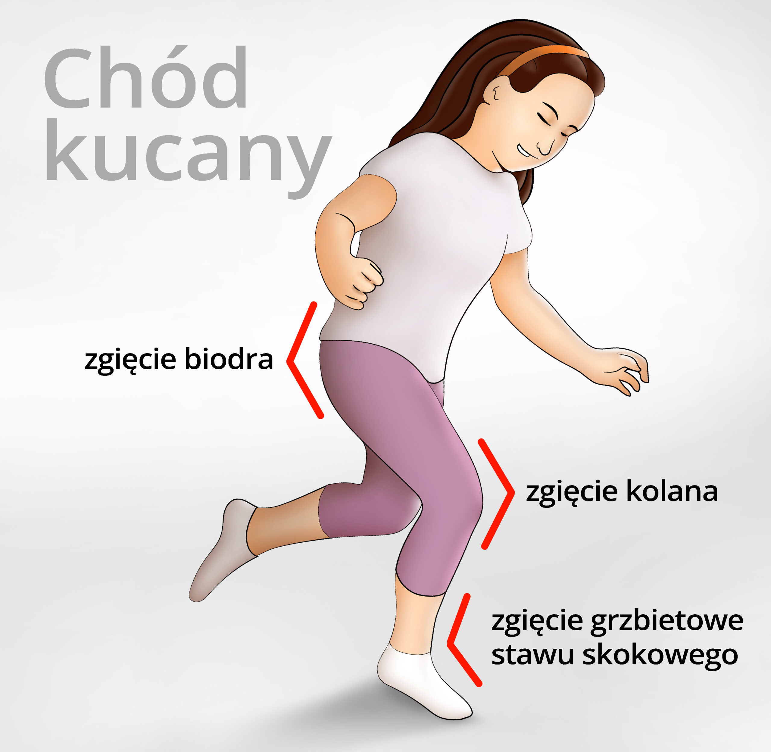 Chód patologiczny, to odmienny od fizjologicznego wzorzec chodu. Jest on skutkiem ogólnie pojętych schorzeń neurologicznych, do których najczęściej zaliczamy Mózgowe Porażenie Dziecięce (MPD). Dysfunkcje układu nerwowego powodują brak selektywnej kontroli motorycznej (ruch en block), osłabienie siły mięśniowej, obecność odruchów prymitywnych i zaburzeń sensorycznych. Dodatkowo brak równowagi między tzw. mięśniami agonistami, antagonistami oraz hipotonia, głownie tułowia, powodują przyjmowanie nieprawidłowej postawy zarówno siedzącej, jak i stojącej. Wytwarzane są patologiczne kompensacje, które prowadzą do zaburzenia wzorcu chodu i ogólnego pogorszenia stanu chorego. Najczęściej występującą postacią MPD jest zespół spastyczny o typie obustronnego porażenia kurczowego (spastyczna diplegia). Wzmożona pobudliwość i kurczliwość mięśni, a także duża obecnośc odruchów głębokich powodują deformacje kostno-stawowe , sztywność i przyjmowanie nieprawidłowej postawy ciała. Brak umiejętności utrzymania równowagi ciała powoduje asekuracyjne, szerokie stawianie stóp, zgięcie kolan i skrzyżowanie się nóg. Znaczące pochylenie miednicy w przód skutkuje przykurczami w obrębie stawów biodrowych. Wraz ze wzrostem dziecka, deformacje pogłębiają się, a rotacja wewnętrzna bioder mocno się utrwala, powodując trudności z przemieszczaniem się i przyjmowaniem innych, niższych pozycji (np. siedzącej). W celu zapobiegania całkowitemu unieruchomieniu pacjenta konieczna jest rehabilitacja. Prawidłowo wykonywane ćwiczenia metodą Bobath lub Vojta, a także systematyczna pionizacja, pozwalają zachować elastyczność mięśni i utrzymać optymalny zakres ruchu stawów.