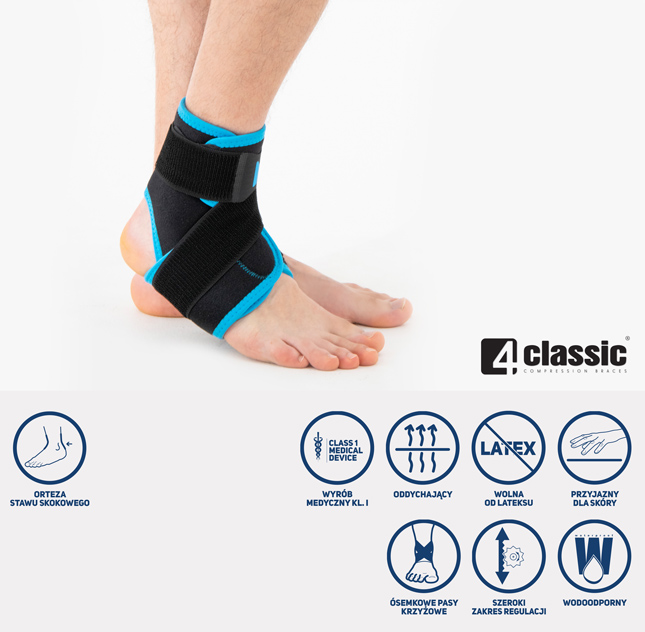 Orteza stawu skokowego U-SS-01 należy do grupy 4CLASSIC, jest wyrobem uniwersalnym – bezrozmiarowym, została wykonana z innowacyjnego surowca UniPren™.Właściwości