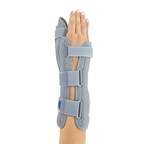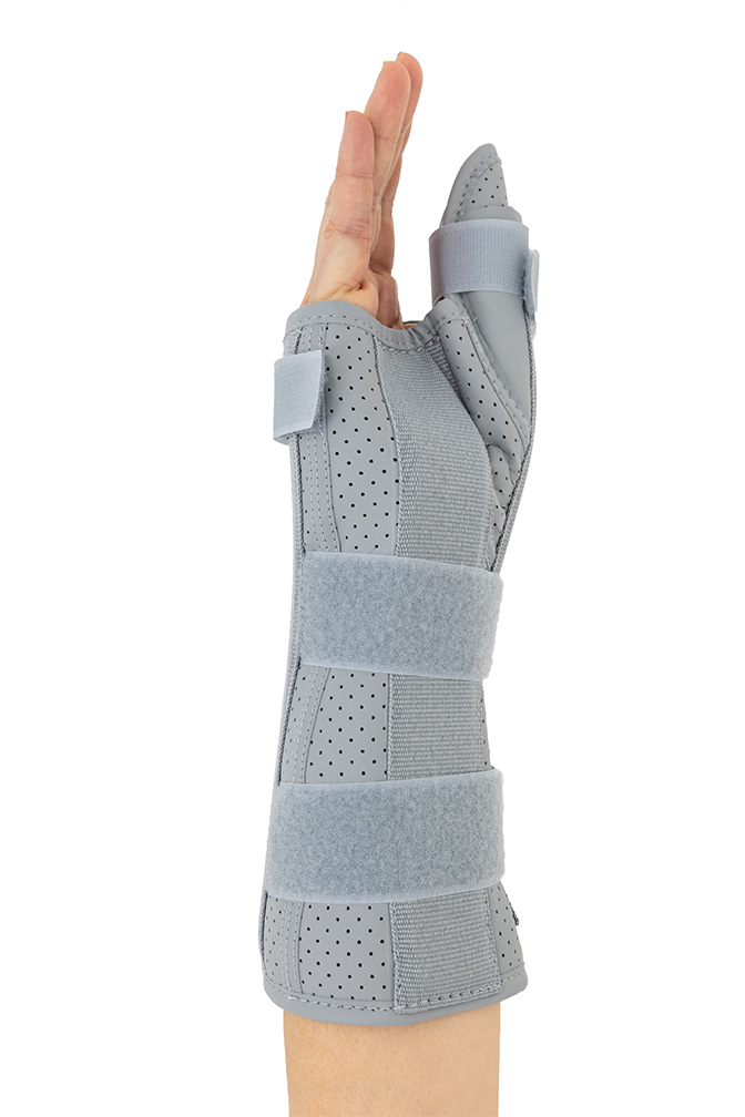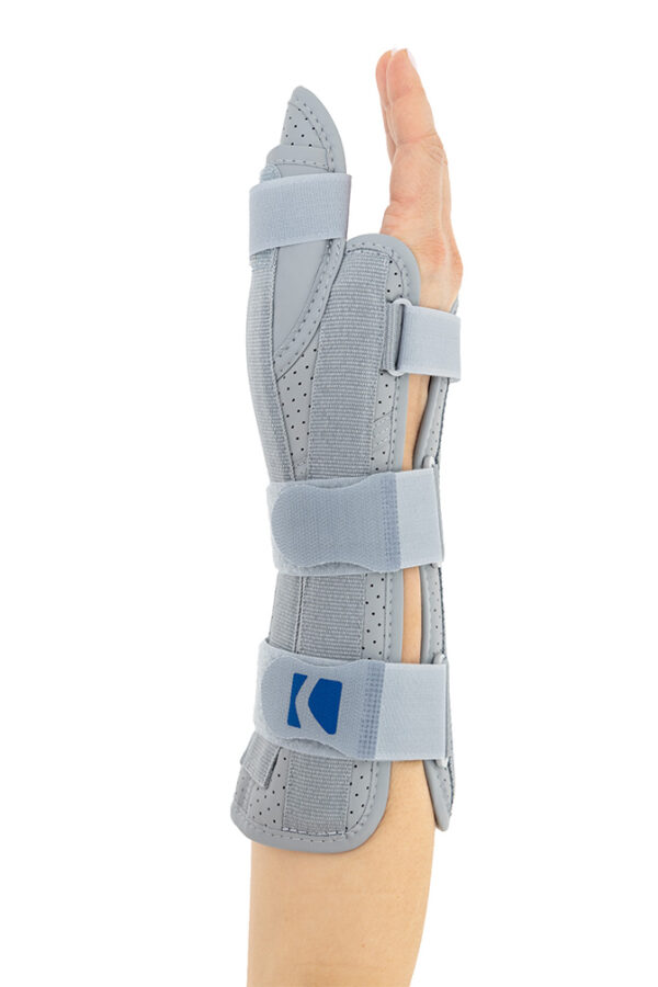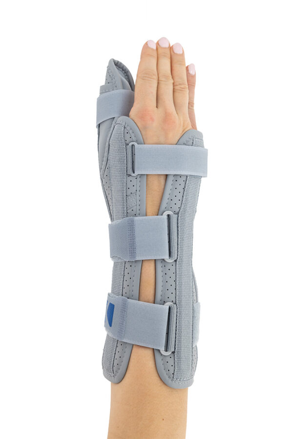 Otwarta orteza nadgarstka została wykonana według nowego bardziej anatomicznego kształtu, dzięki czemu lepiej stabilizuje staw promieniowo-nadgarstkowy i nadgarstek. Wyrób posiada konstrukcję otwartą, co ułatwia jego zakładanie na kończynę oraz regulowane zapięcie przednie, co czyni ortezę jeszcze bardziej uniwersalną i ułatwia dopasowanie do każdego kształtu dłoni. W górnej części wyrobu zainstalowano dwie fiszbiny ortopedyczne, które wraz z łyżką dłoniową przekrojowo tworzą trzy obwodowe punkty podparcia kończyny górnej. Taki sposób stabilizacji przedramienia jest sposobem najbardziej skutecznym. Zapięcia wyrobu wykonano przy użyciu zespołu dwóch szerokich taśm obwodowych oraz jednej wąskiej taśmy dłoniowej. Zakres regulacji zapięć jest bardzo duży i dzięki temu gwarantuje on szeroki zakres regulacji i stabilizacji. Orteza została w całości wykonana z nowego innowacyjnego surowca AirSanmed II™. W dłoniowej części ortezy zainstalowano miękką elastyczną poduszkę poprawiającą komfort użytkowania wyrobu. Konstrukcja ortezy oraz użyte surowce przeciwdziałają wystąpieniu u jej użytkowników zespołu cieśni nadgarstka. W wyrobie zamontowano taśmę stabilizującą kciuk, której nadmiar po dopasowaniu należy odciąć. Dodatkowo w wyrobie zainstalowano aluminiową szynę boczną ze stabilizatorem, której zadaniem jest funkcja odwiedzenia kciuka. Zakres i sposób jego odwiedzenia może być dowolnie kształtowany przez odpowiednie przegięcie szyny.